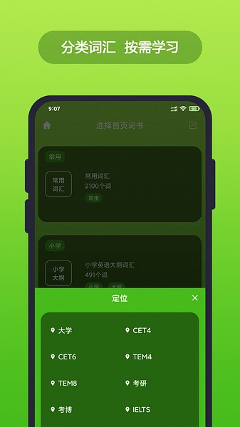 3、”常用词汇”、”CET4”、”CET6”、”GRE”、”雅思”、”考研”、”托福”、”专属词汇”等单词本信息,可根据需求自主选择,分类学习。