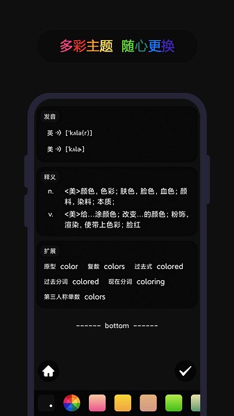 界面设计也很贴心,主题可以换颜色,看起来很舒服,学习的时候心情也更好了。总的来说,这个app不仅是一个词典,更像是一个全能的学习助手,有了它真的让英语学习变得轻松多了!