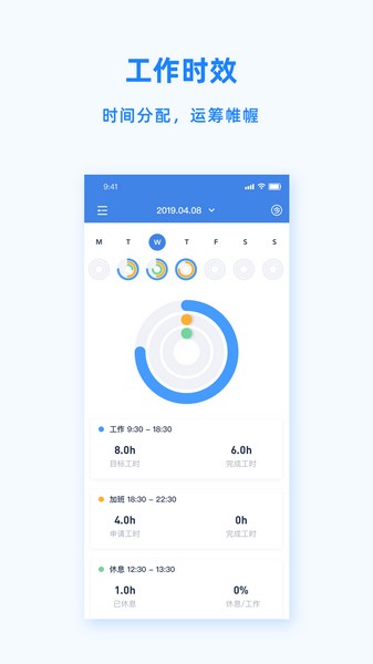 4、智能的工作分配情况,以图形的方式展示每天工作、加班、休息的情况;