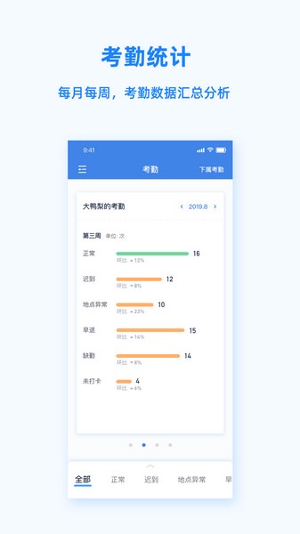 你可以查看实时考勤统计数据,为你提供了每周以及每月的考勤数据汇总分析;