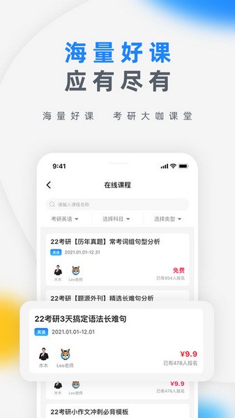 研盒考研app是一款为考研考生准备的备考软件。这款软件可以为用户提供一对一的考研辅导,由学长学姐传授各种实用的考研技巧,助力每位考生顺利上岸。同时,软件内有海量的公开课资源,用户可以根据自己的需求来报名课程,以视频课程和直播为主,配备题库等辅助工具。此外,用户可以制定自己的备考计划,使用软件来督促自己。
