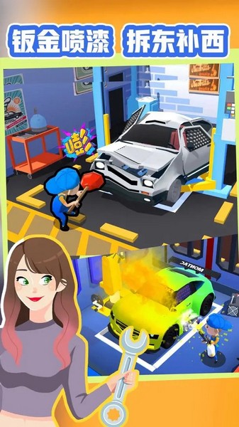 你要在画面中打造独家汽车修理厂,使得游戏中的效率能不断的提高,玩家要在游戏的模拟玩法下真实的感受维修带来的乐趣,你要提供合理的方式和操作在画面中获得更多的收益。