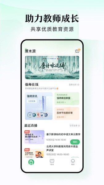 潭水源app旨在通过研修课程、培训学习、教学素材、专家引领等多元服务,系统助力教师专业能力提升和知识分享交流,参与共建高质量的教育行业生态,为每位教师的专业发展注入源头活水。
