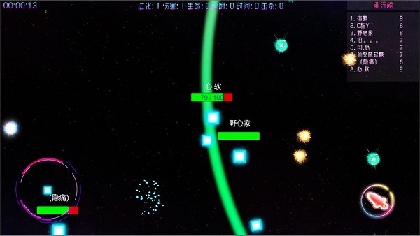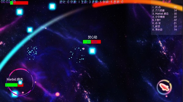 《元素之战》是一款挺有意思的休闲生存小游戏,画面和场景都很酷炫,玩法也很丰富。游戏中你可以操控自己的角色在无重力空间里移动、射击和进化,通过吞噬各种元素来增强实力,还能击退其他玩家的攻击,最后进入决赛圈争夺“元素之神”。游戏设计得很轻松,适合随时随地玩一把,特别是它的射击和击退系统让战斗更刺激。