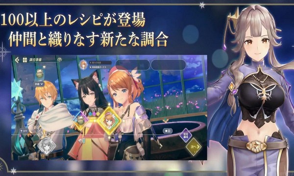 玩家可以使用获得的素材,由多名炼金术士协力进行调和。获得配方后,选择一起调和的角色及素材,善用角色的「天赋颜色」及特性制作道具。