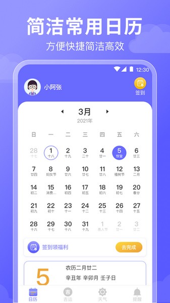 免费日历天气查询软件,将万年历黄历、待办日程管理、天气等实用功能合为一体,合理规划,高效工作,生活服务的好助手。