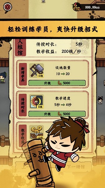 2、闲置经营,依靠简单的合成玩法来收取铜币,开办多家武馆连锁店,持续壮大你的武馆名声。