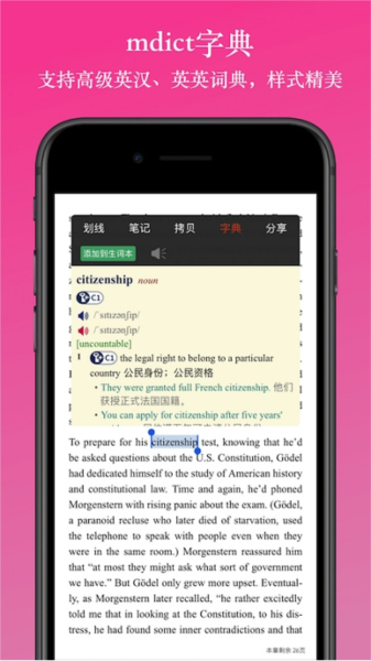 2、mdict字典,支持高级英汉、英英词典,样式精美