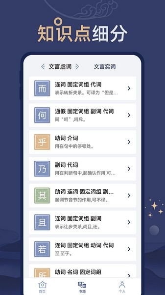 字词专题的设计更适合用户对常用虚词、实词更深入的了解,虚词和实词的详细解析以及对应例句的展示,便于用户熟练该内容,长期积累下来,必能对文言文阅读与翻译有不小的帮助。