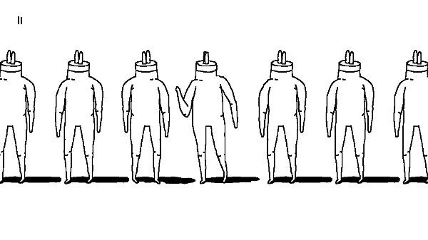 当那个人爬起来后,会走在一个队列之中,似乎在告诉我们它试图在融合进社会这个大群体中,挨个人往右点击即可完成这个画面。