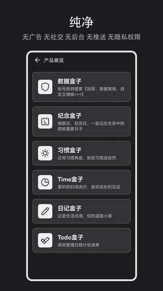【纯净】 无广告、无社交、无后台、无推送、无应用间唤醒、无隐私权限、无乱七八槽的功能,这是专属于您的一片纯净空间。