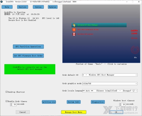 Grub2Win是一款非常小巧的系统启动引导软件,用户可以在这里使用多个操作系统相关的功能,且软件有着极简风格的界面,每个功能都十分清晰。同时它还支持自定义系统启动界面的显示风格,以满足更多用户的喜好。此外软件中提供的设置选项也是很多的,且有详细的系统信息可以查看。