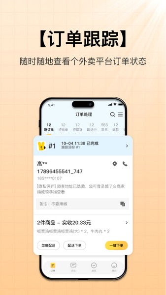 软件提供了订单跟踪的功能,可以一键管理自己的外卖平台订单。