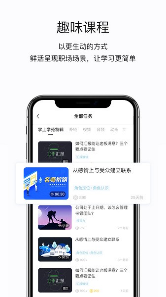 掌上学苑app是一款非常好用的企业员工学习和培训软件,软件内为用户们提供了超多优质的课程资源,并且各个行业的课程都有,帮助大家可以学习到更加专业的技能培训。此外软件内还为大家提供在线培训工具,学员们也可以在这里大家一起交流沟通,互相监督学习等,里面还设有智能班级、任务、考试、课程等功能,助攻学员职场成长。