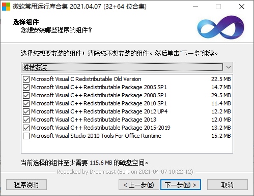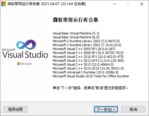 5、微软常用运行库合集2021包含下列组件:Visual Basic Virtual Machine(5.1)Visual Basic Virtual Machine(6.0)Microsoft CRuntime Library 2002(7.0.9975.0)Microsoft CRuntime Library 2003(7.10.6119.0)Microsoft Visual C++2005 SP1(8.0.61187)Microsoft Visual C++2008 SP1(9.0.30729.7523)Mlicrosoft Visual C++2010 SP1(10.0.40219.473)Mlicrosoft Visual C++2012 UP4(11.0.61135.400)Microsoft Visual C++2013(12.0.40664.0)Microsoft Visual C++2015-2019(14.29.30129.1)Mlicrosoft Universal C Runtime(10.0.10586.9)Microsoft Visual Studio 2010 Tools For Office Runtime