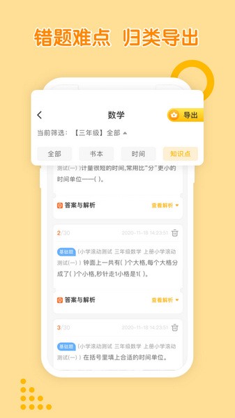 错题本记录: 自动记录学生练习中的错题,根据学科和学期进行分类收集,为学生发现和解决学习中的薄弱环节提供有效帮助。