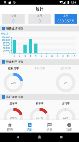 此外,应用还提供了实时车辆状态查看、GPS定位车辆位置、泵送方量和非泵方量信息等功能。发货统计、出车统计和剩退统计版块让用户能够详细掌握企业的发货动态和车辆使用情况,分析原因并优化管理。