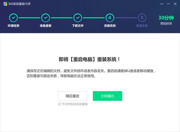 5. 快速:一般重装系统加上装驱动、补丁、软件没有两三个小时完不了时,使用360系统重装大师,只要半个小时,就把驱动、补丁、软件都装好了。
