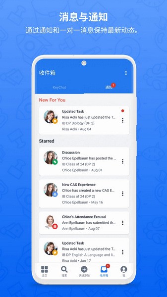 2. 功能导航:主页面菜单导航简单直观,用户可以在不同模块和列表视图之间轻松切换。学生用户可以快速添加课程作业、使用移动端扫描仪、添加cas体验或发布反思,并一键访问消息和通知。