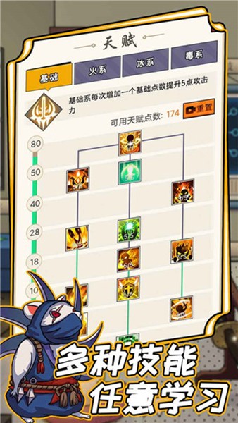 2、玩家能够通过战斗闯关,解锁新的技能,可以洗练和选择不同的属性。