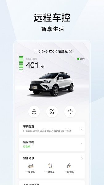 1、远程控车:支持使用云度APP解锁车门、打开空调、打开车灯、一键寻车、实时显示车辆状态及位置。
