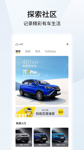 2、社区交流:官方带您全方位了解云度汽车各车型及产品科技,车友共同交流,线上线下组织活动,让您购车后的生活更加丰富多彩。同时还有更多车主及工程师在线解答用车问题。