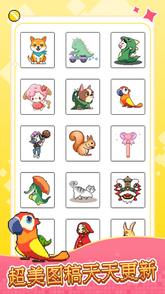 2、每日更新像素图:像素小画家每日为你准备全新的精美像素图画等你数字涂色,涂色完成后与好友一起分享像素佳作。