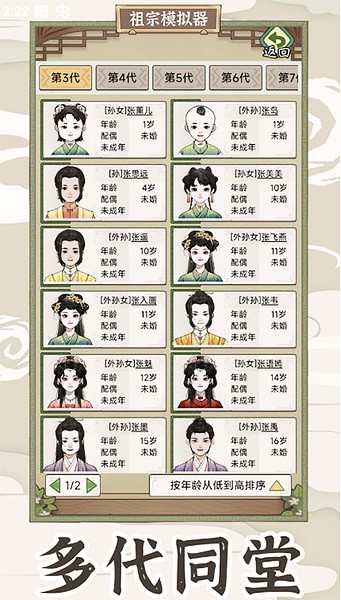 家族系统:游戏采用家谱的形式来展现家庭成员之间的关系和传承,玩家可以自由选择完成各种事件来提升角色的属性,并见证自己家族的兴衰,体验不同历史时期的社会文化特征。