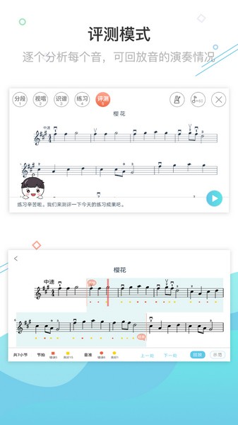 跟着提示逐音演奏。用al记录并计算演奏结果,分析错音原因,并提示正确的指法或把位。