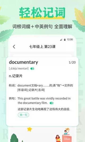1、15000+张单词卡片(不断增加中),全情景配图式记忆,全老外真人朗读例句。