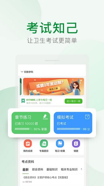 考试知己APP是一款主打职业考试题库在线学习的软件,其专为医学护理类相关专业用户准备,覆盖了全国卫生专业技术考试大纲,帮助用户快速寻找重点练习,且所有难点、要点都搭配了权威专家的解析,为你带来更多帮助!而在学习完毕后,还能通过软件进行模拟自测,海量题库搭配历史真题任你随心练习,错题还会自动记录至错题本,方便用户进行纠错复习!