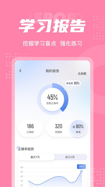 【多样式的刷题模式】内含考点练习,全国通用卷以及地区卷模拟练习,以及按照固定考试比重的随机式的抽题的真题考场,成绩单实时记录考试数据,一点一滴的反馈考生近期学习状态以及自我正确率的提升,给予考生通过考试的信心。