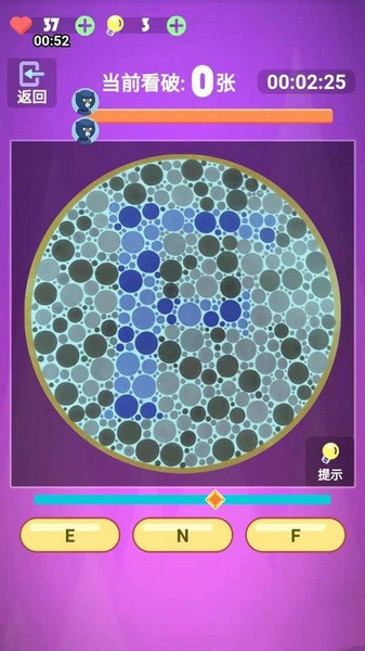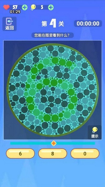 在色盲模拟器中,你将面临一幅幅色彩深浅交织的画卷,每个画面都巧妙地编织着数字或字母的形状。你需要用敏锐的洞察力,透过色彩的迷雾,正确回答出所见内容。游戏不仅提供了丰富的关卡以供挑战,更有实时竞技模式,邀请好友一同比拼色彩辨识速度,增添互动乐趣。无论你是色彩感知达人,还是对色彩有一定困扰的朋友,都能在这款游戏中找到属于自己的乐趣与挑战。