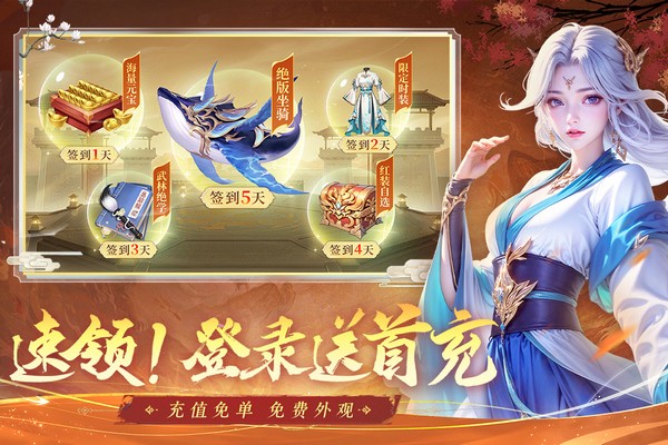 每天登录畅享零元购,多款限定时装免费领。野外成功狩猎巨兽boss,即可随机掉落钻石、神装、秘籍功法等海量奖励,还有各种灵宠异兽等你来收服。百万钻石签到就送,不肝不氪让利玩家,每天登录可领上千钻石,白嫖玩家也能轻松在江湖中称宗做祖,开宗立派!