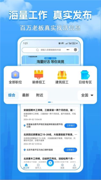 【产品特色】工地招工、同城急聘、定位招工、技术工招聘、散工招聘