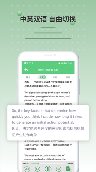 5、内容针对不同英语程度的学习者提供全英文和中英文对照两种模式,并可以随意切换;