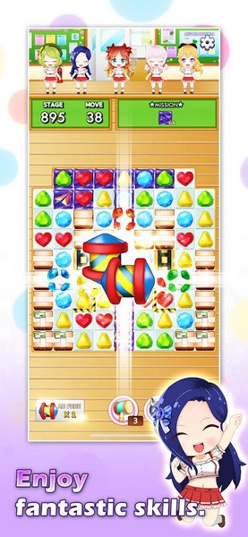 玩法融合创新:集消除、装扮、养成于一体,玩家能同时体验多种玩法乐趣。消除玩法中,通过移动并拼凑三个以上相同颜色的珠宝进行消除,配对消除4个和5个宝石可收集独特道具,用强大道具扫除障碍完成任务。