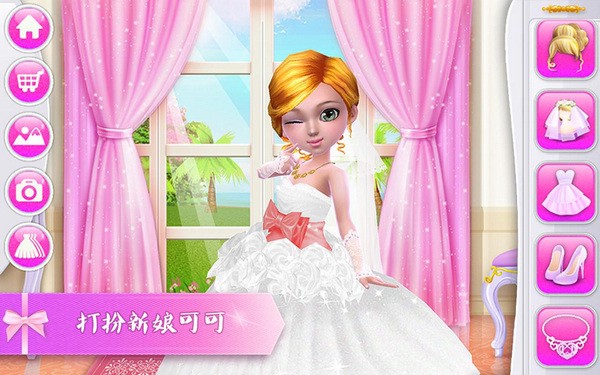 1、在本站下载安装好可可婚礼游戏,打开进入,左侧分别是主页、购物车、背景图、真实拍摄以及套装推荐。