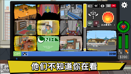 2、简洁像素游戏画风,用金币解锁更多的摄像头,偷窥更多的地方;