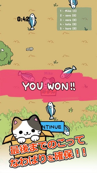 4、在收集鱼干的时候如果旁边突然来了别的小猫,你可以松开手指,小猫就会躲回箱子里,逃过一劫,成功在游戏时间内生存下来,即可领养小猫。