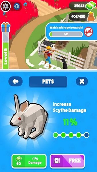 不断升级和解锁:玩家可以通过收割庄稼赚钱,升级镰刀和房子,解锁更多的内容和玩法。