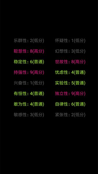 结果分析:游戏结束后,会根据玩家的答题情况提供详细的性格分析报告,包括性格、情感状态、个性偏好等多个方面的描述。