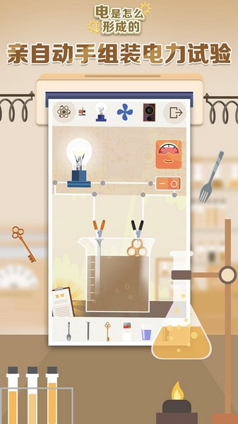 与实验室所制作的实验相类似,提供闭合的电路、电解质和各种金属和器具,对比分析帮助你更好的进行电力形成。
