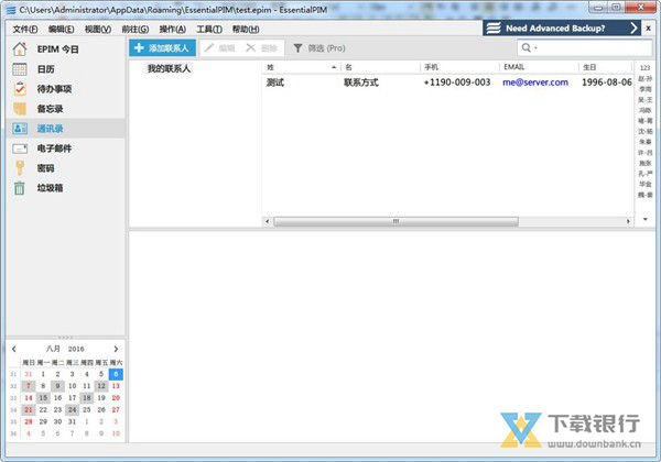 EssentialPIM绿色版是一款非常安全的个人信息管理软件,这里有诸多工具可以帮助用户管理多种类型的隐私信息。我们可以在软件中添加联系人,除了编辑电话号码、头像和邮箱地址外,还能备注公司、职务及生日等等。而这里还有电子邮件和密码管理功能,再也不怕忘记重要的账号密码。此外我们也可以在软件中通过多种方式添加任意数量的待办事项,还能记录笔记。