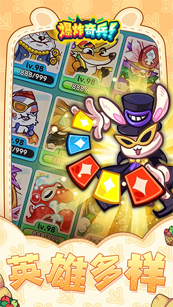爆炸奇兵是一款集萌宠、合成于一身的休闲益智手游。游戏里有各种不同的角色,每个角色都有不同的属性加成,面对不同的对手要选择不同的阵容搭配,这样才可以把不同角色的优势都发挥出来。除此之外,游戏里还有很多游戏玩法,玩家可以选择单人或者多人玩法,每个玩法的获胜条件也不相同,在给玩家带来挑战的同时,这给玩家增添了更多的可玩性。
