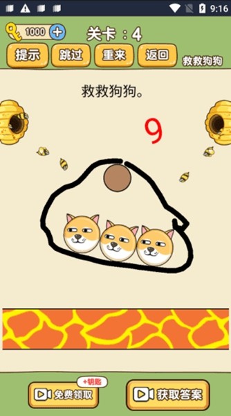 画线救援:玩家需要通过画线的方式来构建防护屏障,阻止蜜蜂等危险因素接近狗狗。这个过程需要玩家仔细观察关卡布局,寻找最佳的画线方案。