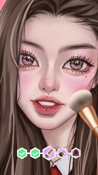 1、选择不同风格的化妆品,逐步操作这些化妆工具,这样就可以对角色进行脸部化妆、发型调整、装饰搭配等,带给您很多轻松的游戏操作,从而改变角色的妆容,变得更加漂亮,惊喜多多。