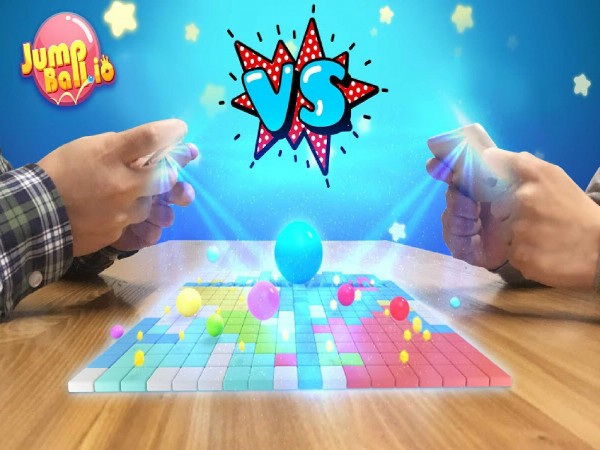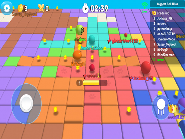 对于游戏的玩法,总的来说还是属于比较容易上手的那种,左侧移动,右侧跳跃非常的中规中矩,与一般的Io游戏相类似,同样以控制球球通过吃豆豆来变大,但与之区别的就属跳跃能够以十字的形式占据周围的领地面积,在这些面积上会随机出现豆子,且移动速度增加。