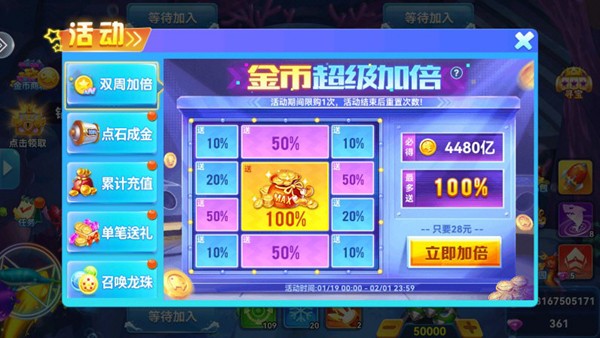 丰富多彩的超新玩法,神魔令、神器锻造、卡牌收集、猛兽抓捕、宝藏悬赏等多种玩法开启,丰厚惊喜,全方位体验不只是捕鱼的乐趣,精品街机捕鱼全新玩法,一起欢欢乐乐捕鱼去~