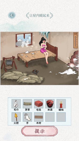 (5)把手拖到干草上获得馒头,再将馒头拖动给女人,吃完就能暖和了。